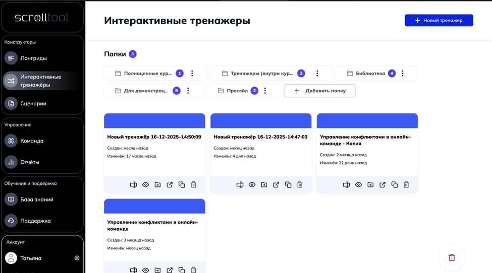 В модуле «Интерактивные тренажеры» есть возможность объединять отдельные тренажеры в папках. Это помогает организовать хранение тренажеров, особенно, если их накопилось очень много. Вот как выглядят папки в модуле: