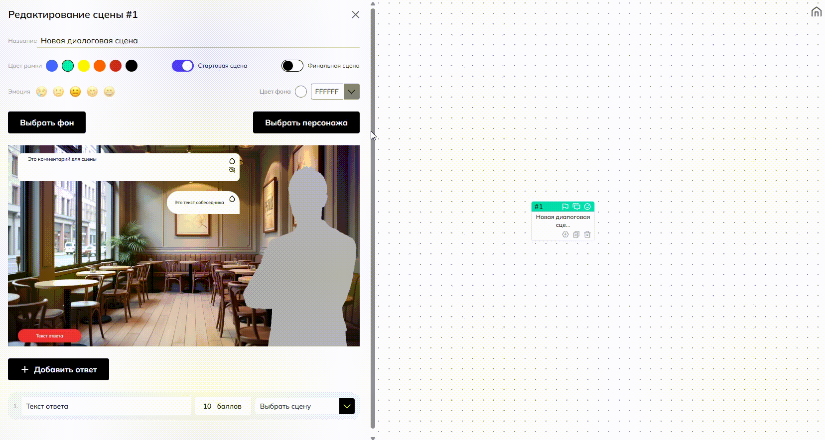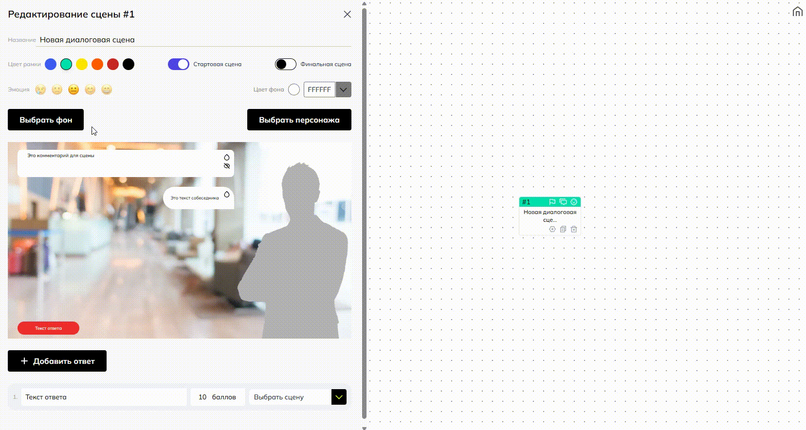 Создаем финальную сцену диалогового тренажера, заполняя нужные элементы:
