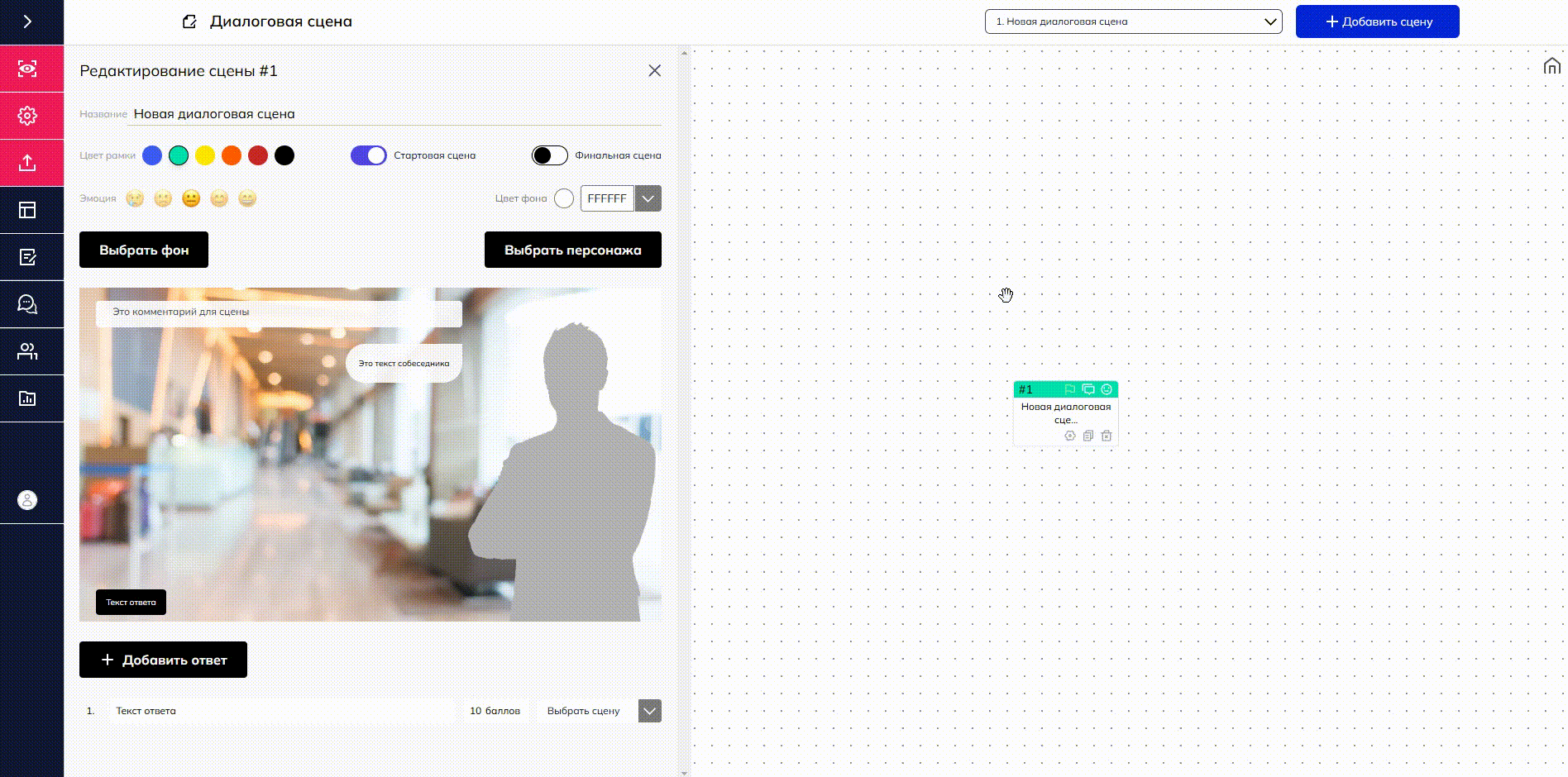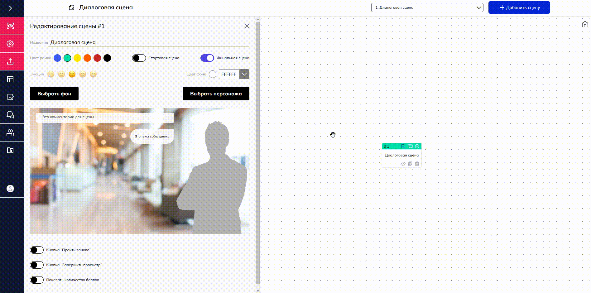 Сцена "Диалог" включает в себя следующие элементы и возможности: