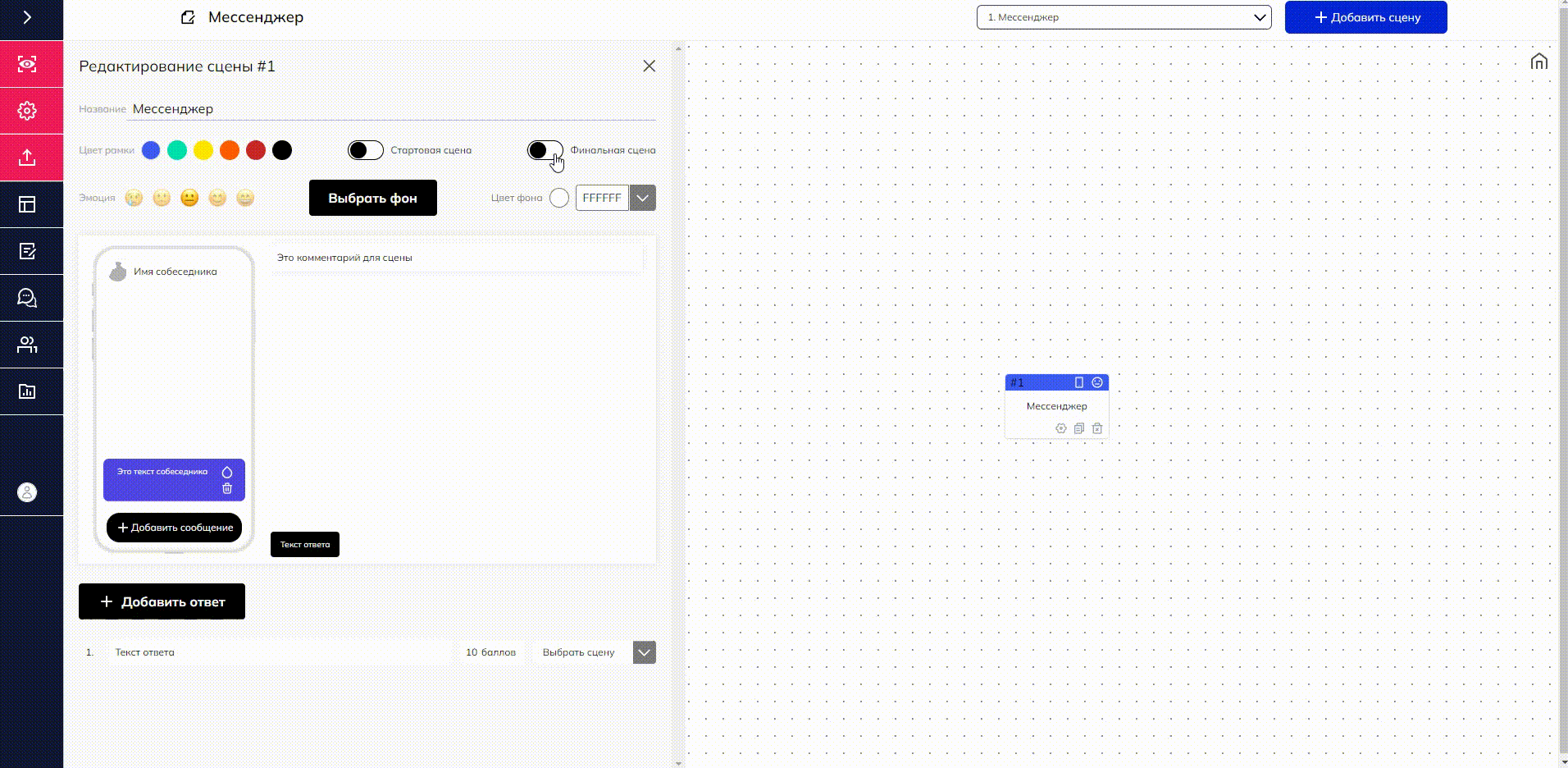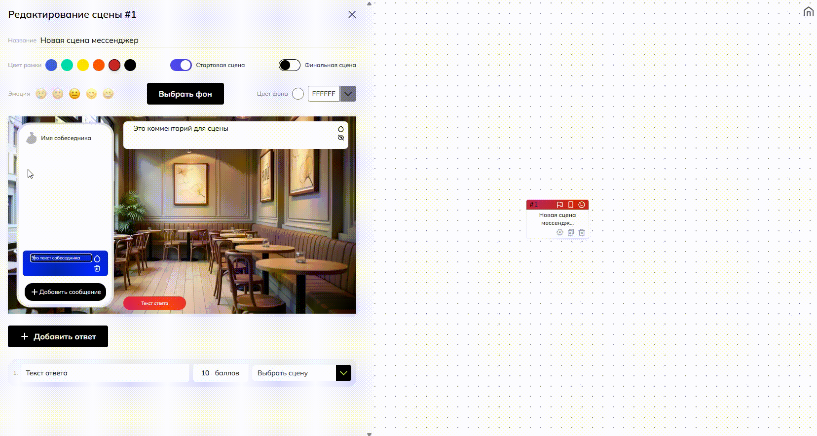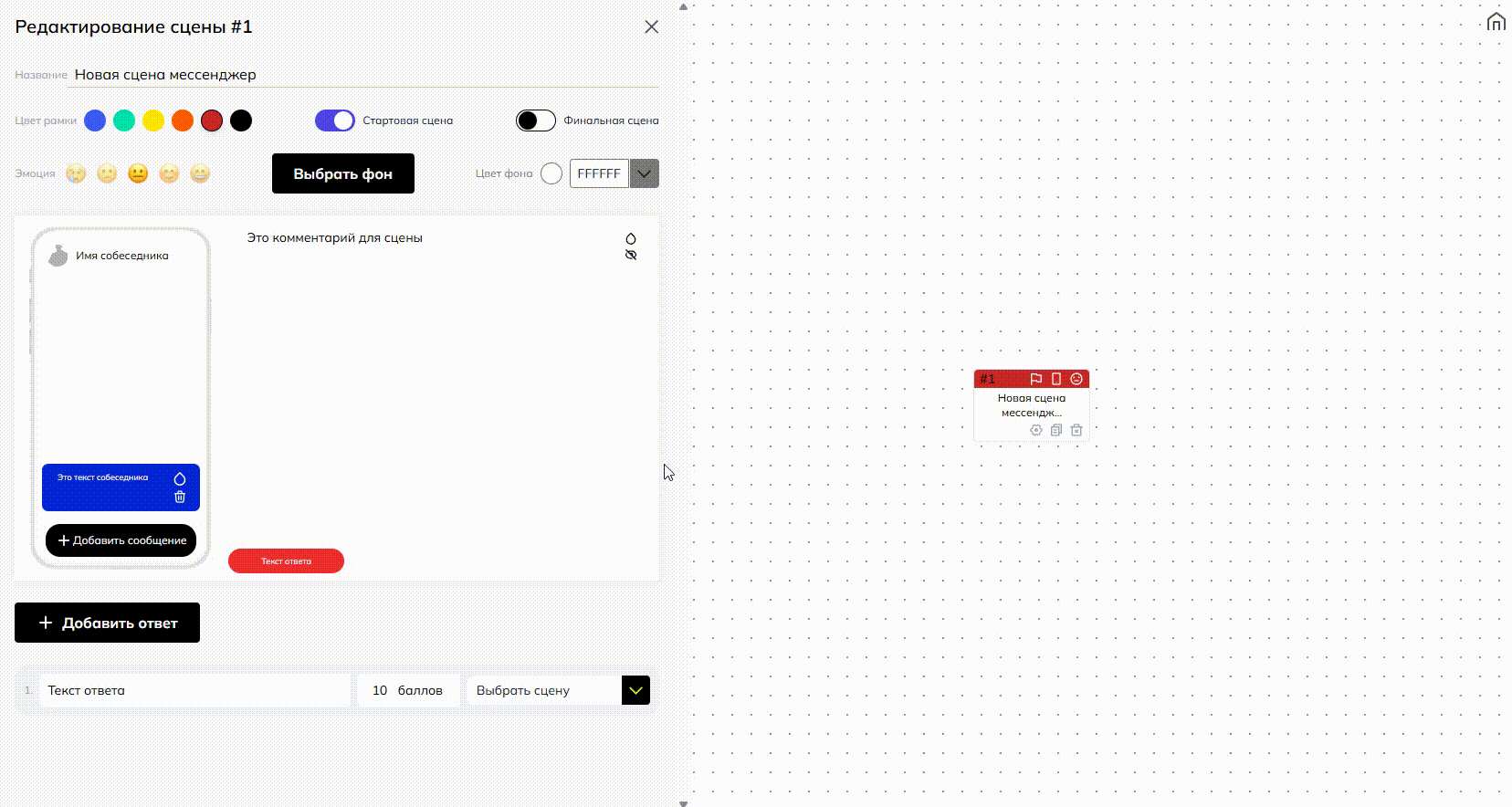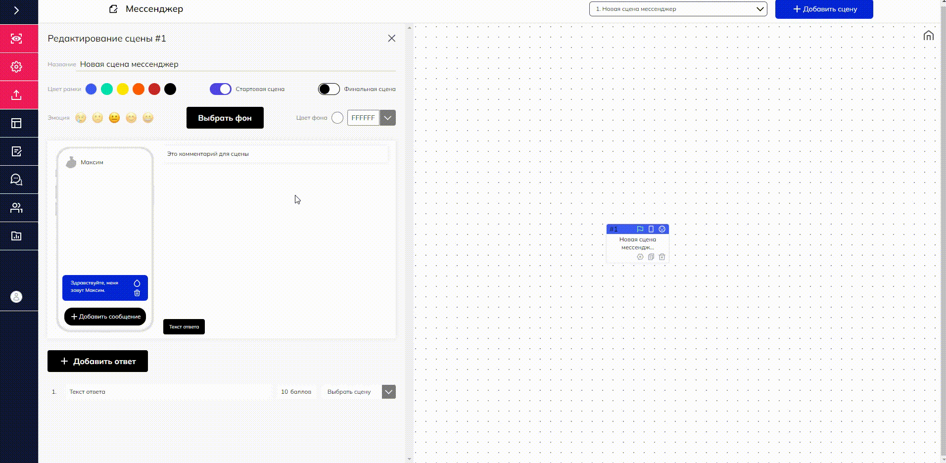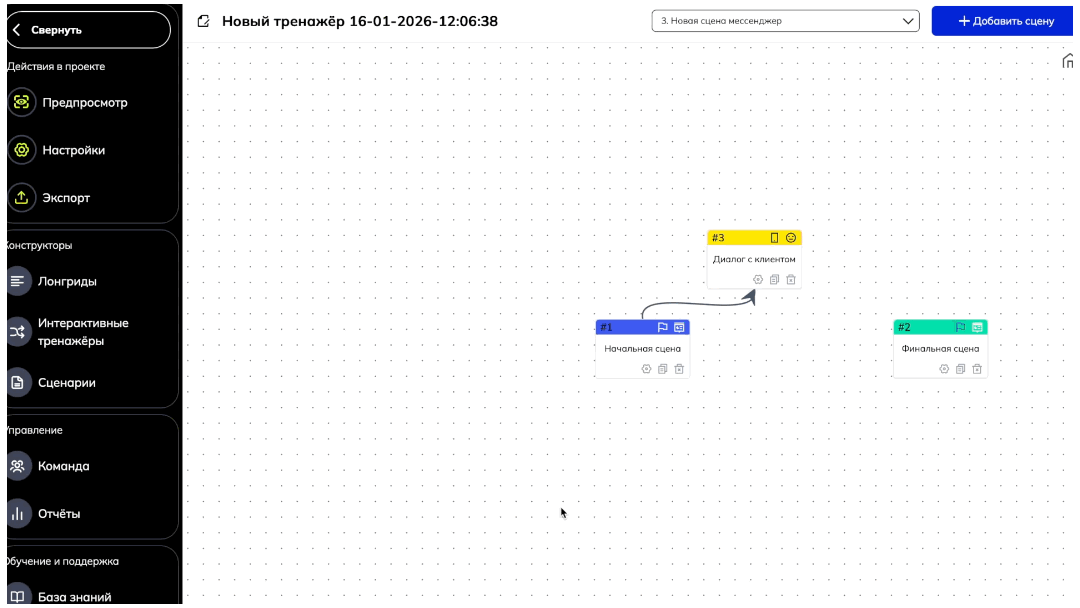 У вас готова и настроена связка сцен «Начальная сцена» — «Сцена „Мессенджер“». Теперь от сцены «Мессенджер» необходимо настроить варианты ответов, которые могут вестит к разным развилкам сюжета вашего тренажера: