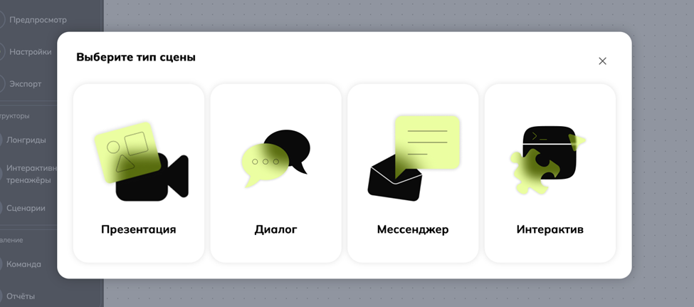 При создании интерактивного тренажера вы можете свободно комбинировать разные типы сцен. Нет никаких ограничений ни по количеству, ни по видам используемых сцен. Главное — сохранять целостность сюжета и учитывать образовательные цели.