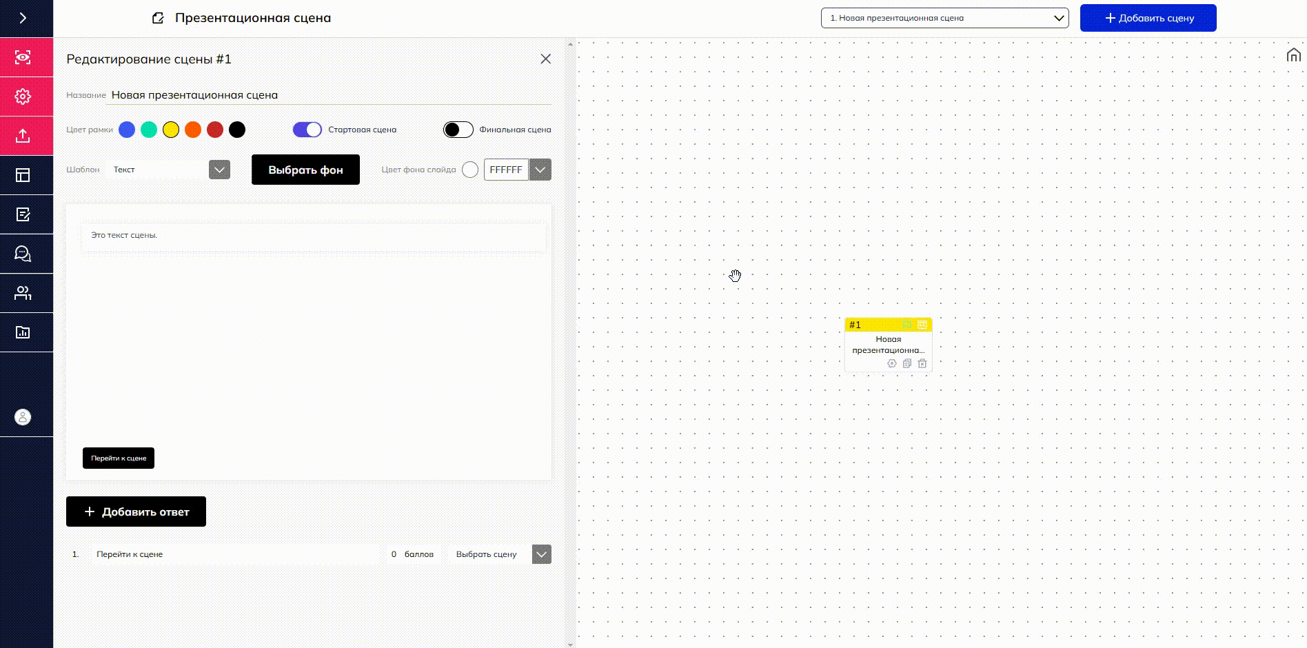 Когда вы хотите завершить тренажер, то вы можете сделать сцену финальной, на которой и будет заканчиваться ваш проект. Для этого необходимо передвинуть кнопку "Финальная сцена".
